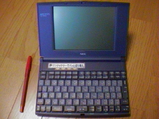 NECのARDATA(アルデータ)というA4サイズの携帯ワープロです。重さが750gと1Kgを切り、乾電池で動きます。パソコンのようにすぐバッテリー切れしない! しかも買ったときからフロッピーディスクドライブが付いてくるというので買ってしまいました。キータッチも悪くありません。 ただ、750gでも他の荷物といっしょに持ち歩くにはつらい。だから最近はNECのモバイルギアが欲しいですね。 |